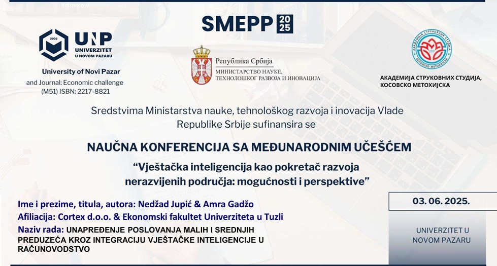 Naš predstavnik, Nedžad Jupić izložio je naučni rad UNAPREĐENJE POSLOVANJA MALIH I SREDNJIH PREDUZEĆA KROZ INTEGRACIJU VJEŠTAČKE INTELIGENCIJE U RAČUNOVODSTVO.