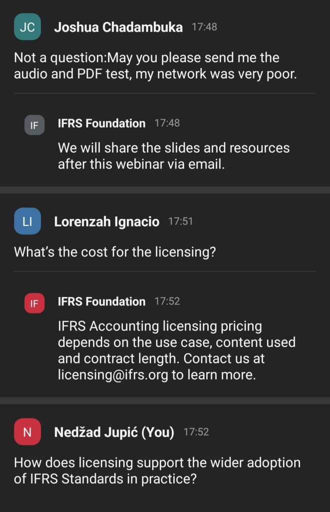 Razmijenjena su iskustva i praktični primjeri koji se odnose na komercijalnu primjenu i licenciranje IFRS standarda u različitim poslovnim kontekstima.